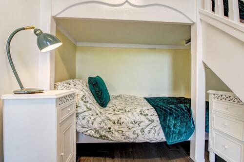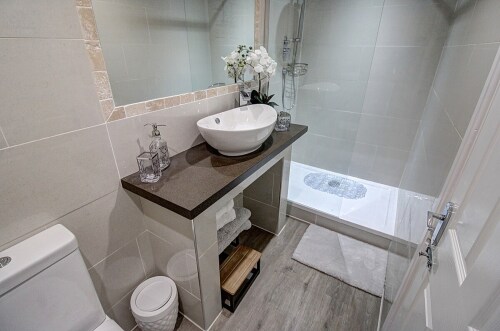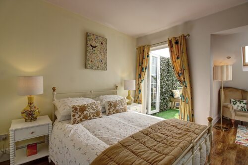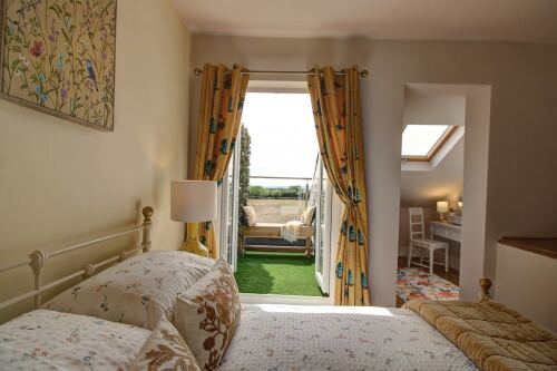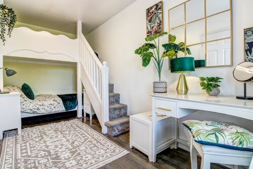 Upstairs, three beautifully appointed bedrooms await: a double room with a private terrace and stunning views, a chic bunk room, and a tranquil single room. Downstairs, the king bedroom with private en-suite offers a secluded sanctuary for rest and relaxation. All bedrooms feature dressing tables and dedicated areas to get ready, complete with premium linens for your comfort. A luxurious family bathroom with a shower over bath completes the upper floor.