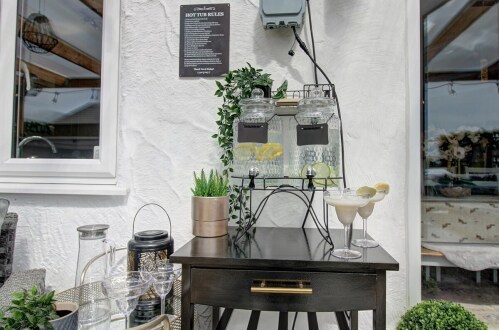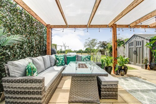 Step outside to a sun-drenched, south-facing garden with expansive seating, a gas BBQ, fire pit, and a private hot tub with built in drink holders—perfect for al fresco dining whilst enjoying countryside views.